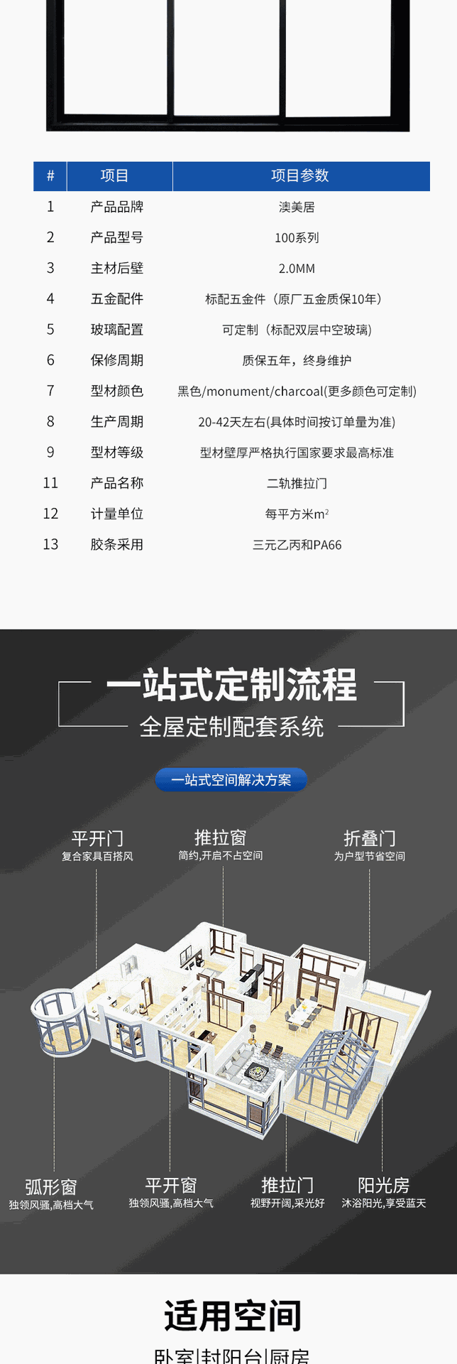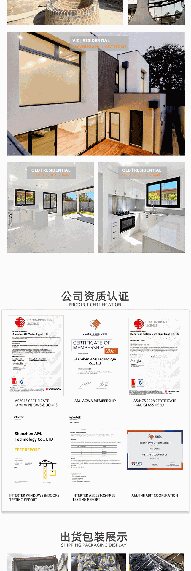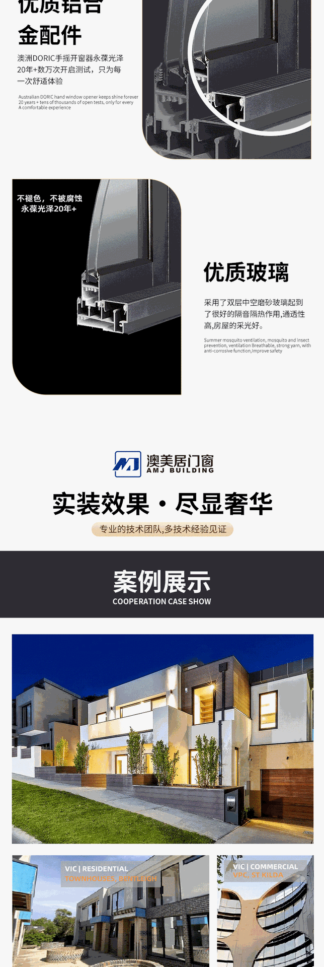 门类型:推拉门 材质:铝合金 标准玻璃:5+12A+5mm双层钢化透明玻璃 型材厚度:2.0mm 最大尺寸(宽*高):2000*3000mm 最小尺寸(宽*高):750*550mm AMJ 100 系列推拉门,专为无与伦比的性能和现代优雅而设计。作为AMJ高端铝和玻璃产品系列的一部分,这款通过AS2047认证的滑动门将坚固的结构与时尚的美学相结合。