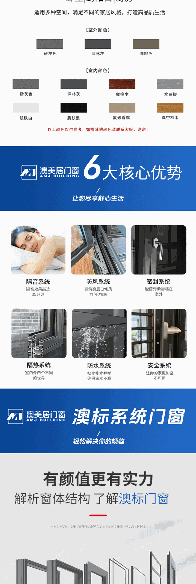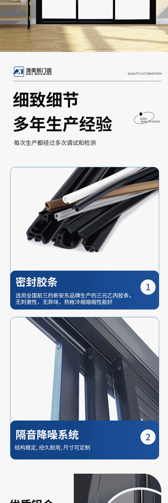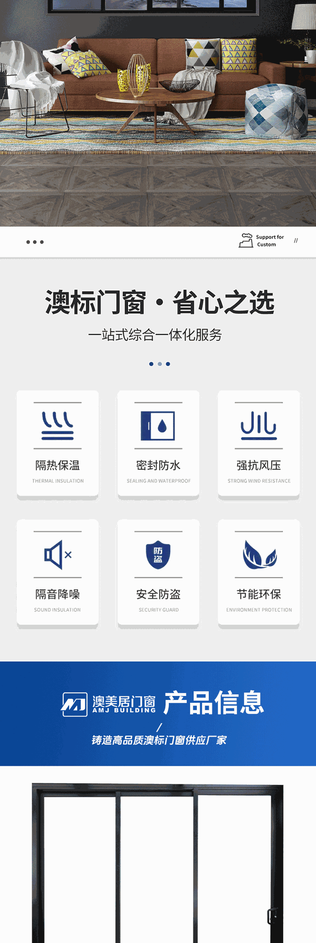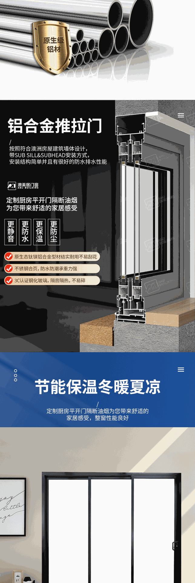 门类型:推拉门 材质:铝合金 标准玻璃:5+12A+5mm双层钢化透明玻璃 型材厚度:2.0mm 最大尺寸(宽*高):2000*3000mm 最小尺寸(宽*高):750*550mm AMJ 100 系列推拉门,专为无与伦比的性能和现代优雅而设计。作为AMJ高端铝和玻璃产品系列的一部分,这款通过AS2047认证的滑动门将坚固的结构与时尚的美学相结合。